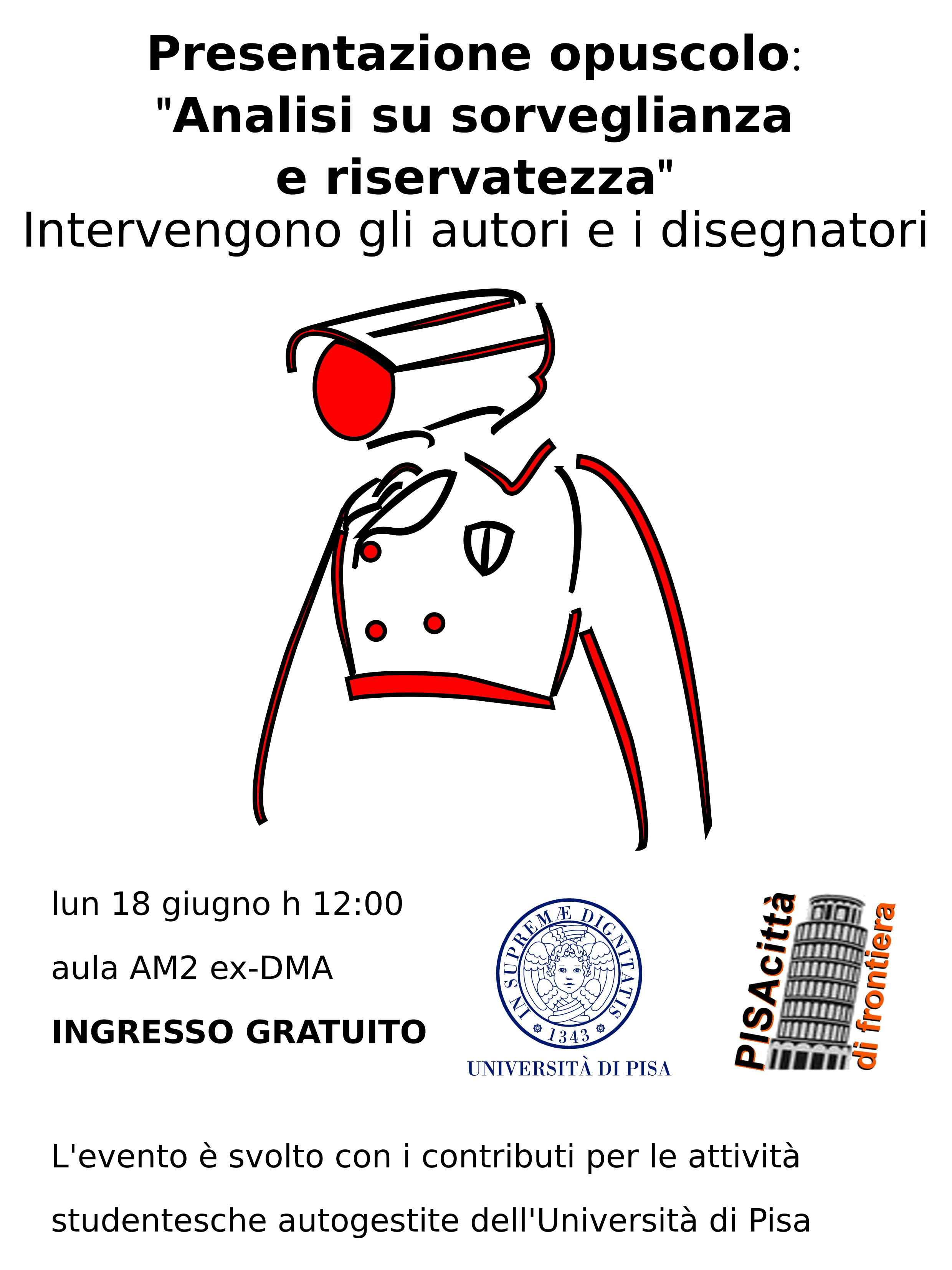 Lunedì 18 giugno alle 21.00 nell'aula AM2 ex-DMA del dipartimento di Matematica, si terrà la presentazione dell'opuscolo "Analisi su sorveglianza e riservatezza" alla quale parteciperanno gli autori e i disegnatori.