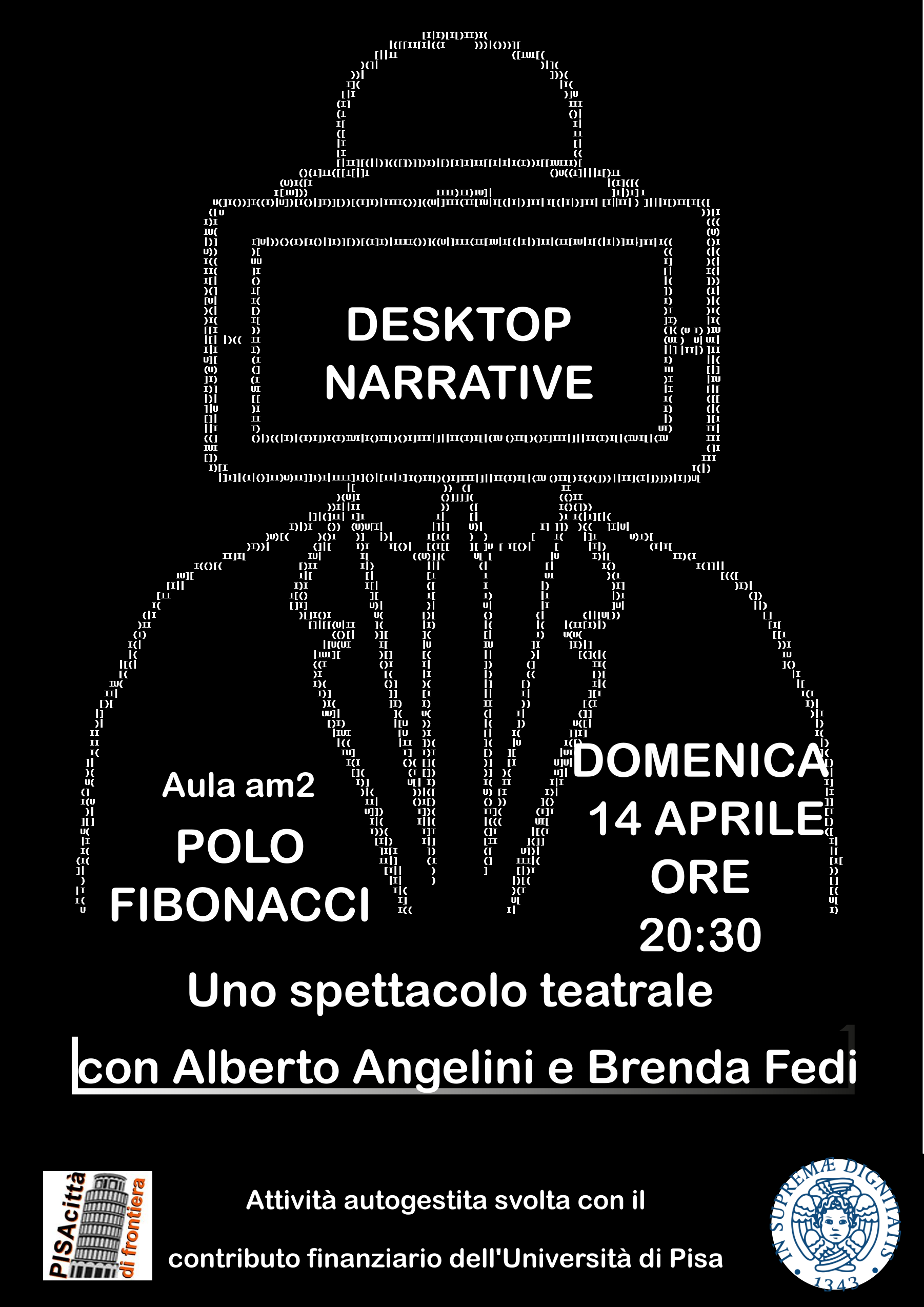 Domenica 14 aprile, alle ore 20,30, presso l'aula am2 del Polo Fibonacci, avrà luogo "Desktop narrative", uno spettacolo teatrale con Alberto Angelini e Brenda Fredi.