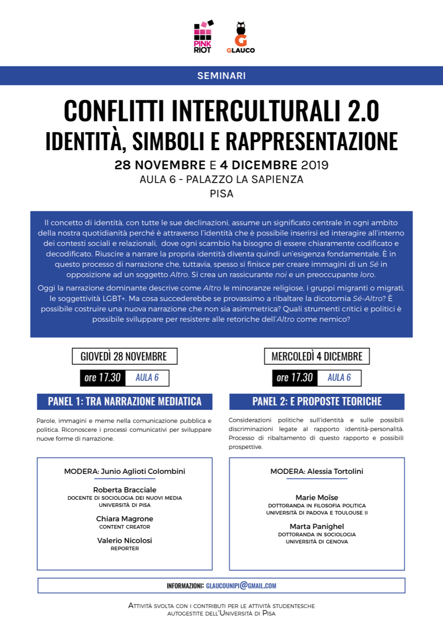 Prende il via il ciclo di seminari "Conflitti interculturali 2.0. Simboli, identità e rappresentazione. Tra narrazione mediatica e proposte teoriche". Il ciclo, composto da due incontri, è organizzato con il contributo dell'Università di Pisa (rif. 1986).