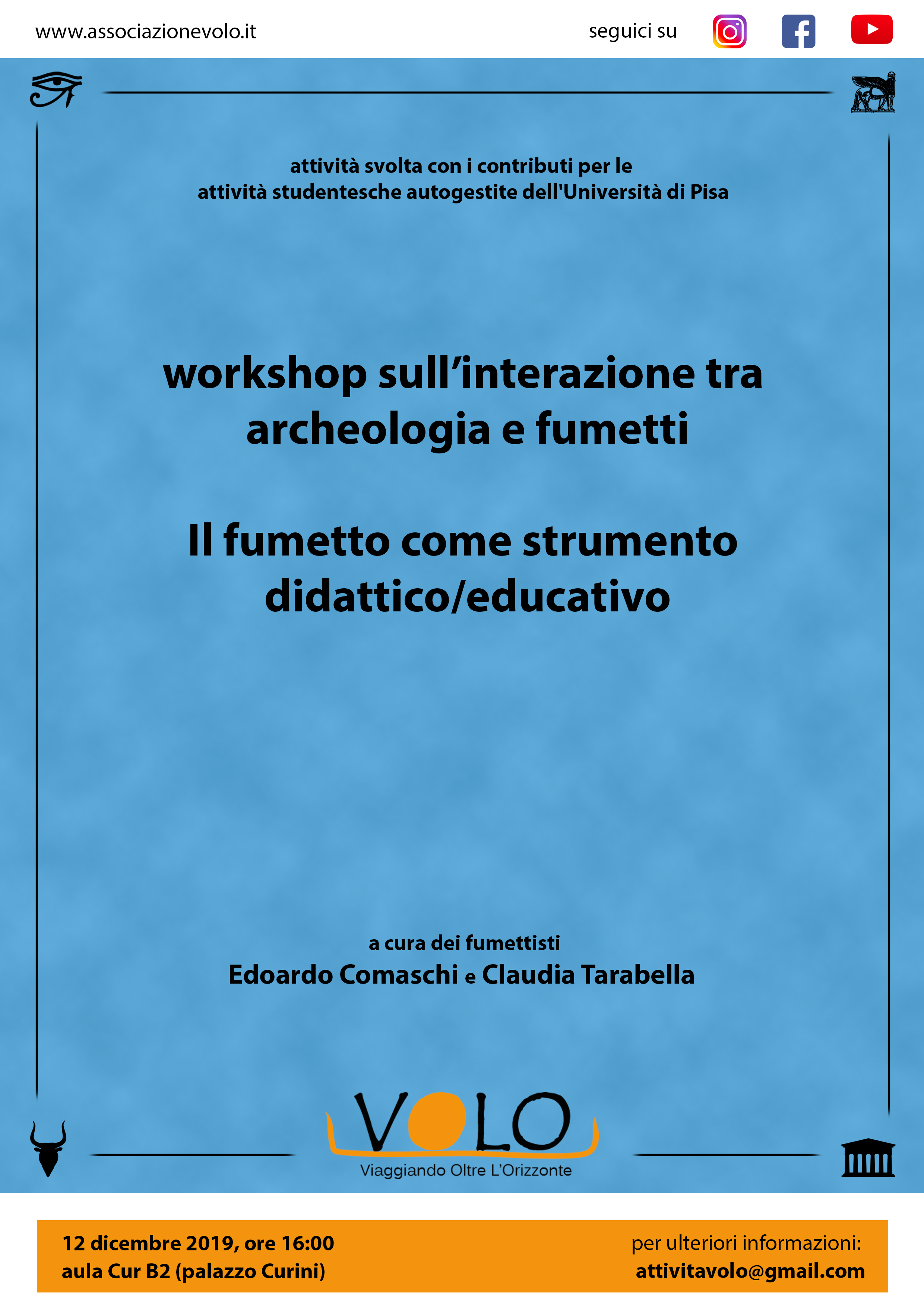 Giovedì 12 dicembre alle ore 16.00 presso l'aula Cur B2 di Palazzo Curini (Via Santa Maria, 89) si terrà il workshop "Il fumetto come strumento didattico ed educativo" sull'interazione tra archeologia e produzione di fumetti, a cura dei fumettisti Edoardo Comaschi e Claudia Tarabella.
