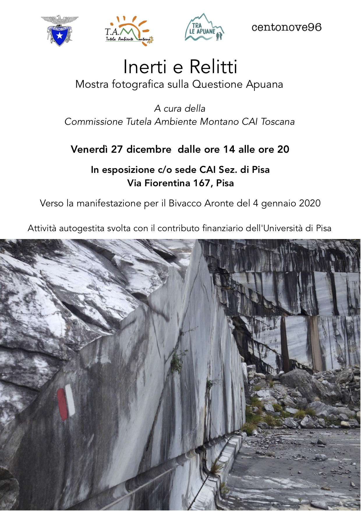Venerdì 27 dicembre 2019, dalle ore 14,00 alle ore 20,00, presso i locali della Sede del CAI, Sez. di Pisa, in Via Fiorentina 127, avrà luogo "Inerti e Relitti", mostra fotografica sulla Questione Apuana. Le fotografie, messe a disposizione dalla Commissione Tutela Ambiente Montano del CAI Toscana, sono informative del conflitto socio-ambientale che si sta verificando sulle Alpi Apuane, per cui è stata indetta una manifestazione pubblica in data 4 gennaio 2020 e su cui l'associazione Centonove96 si sta impegnando attraverso una formazione rivolta agli studenti universitari. L'evento è organizzato dall'associazione Centonove96 con il contributo finanziario dell'Università di Pisa (rif. 2102).