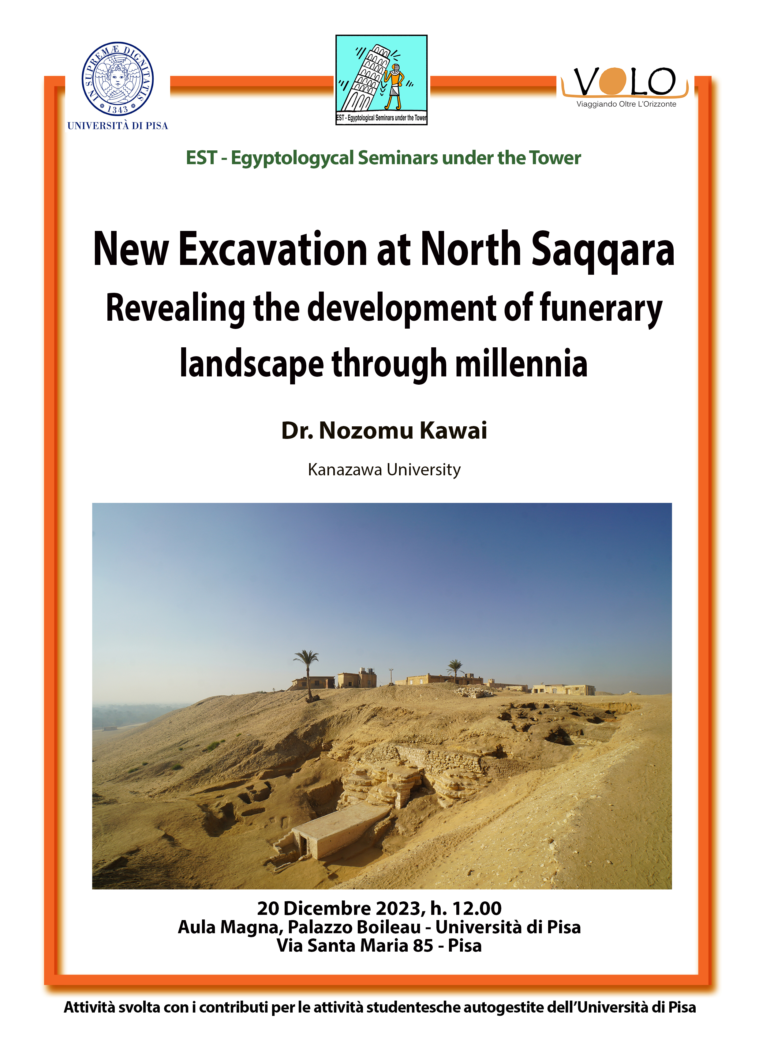 Mercoledì 20 dicembre, alle ore 12.00, presso l'Aula Magna di Palazzo Boileau, avrà luogo l'incontro con il dottor Nozomu Kawai (Kanazawa University) dal titolo "New excavation at North Saqqara. Revealing the development of funerary landscape through millennia".