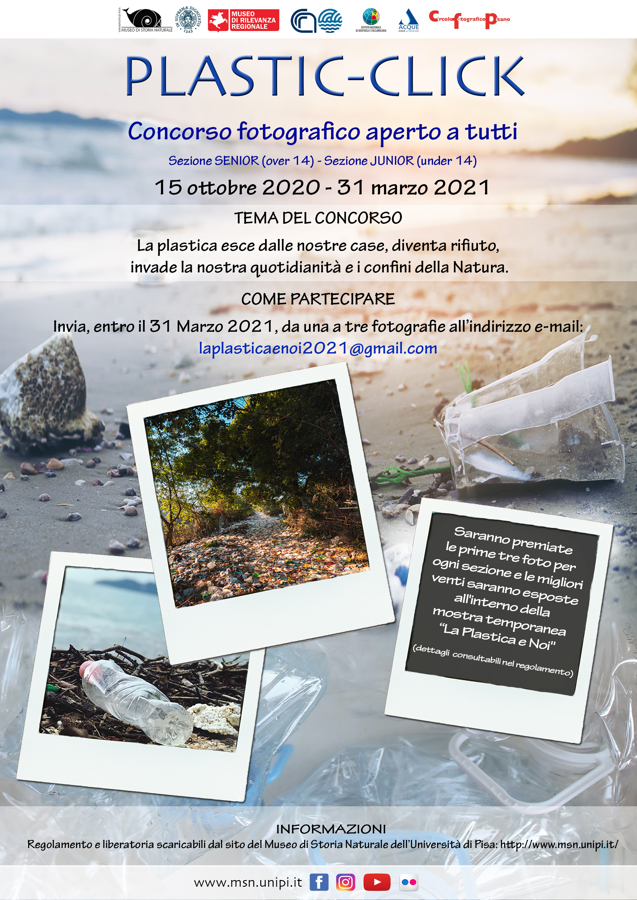 In occasione della mostra temporanea “La plastica e noi” il Museo bandisce il concorso "Plastic-click", che ha come tema l’inquinamento da plastica che incontriamo quotidianamente nelle nostre vite. Rifiuti abbandonati lungo sentieri, spiagge, marciapiedi, parchi pubblici, scuole, centri storici, saranno i soggetti che permetteranno di inquadrare la portata del problema, con l’obiettivo di esprimere un punto di vista personale.